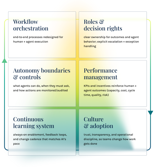 The transformation establishes the governance structures, workflow orchestration patterns, decision rights, and performance systems required for AI-enabled execution at enterprise scale.