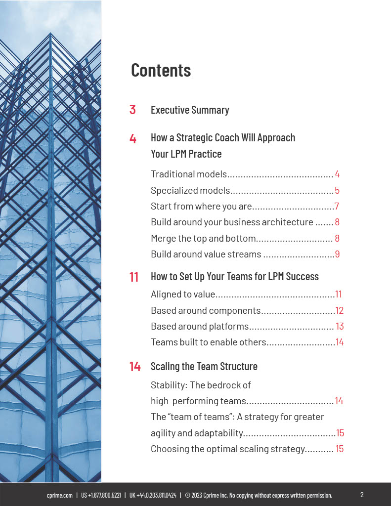 No two companies are exactly the same. There are countless nuances involved in structuring the optimal LPM practice for each organization. So, if a consultant comes in and recommends some cookie-cutter plan they’ve used a thousand times, don’t be fooled. However, there are some basic approaches that can be used, combined, and customized to unique circumstances.